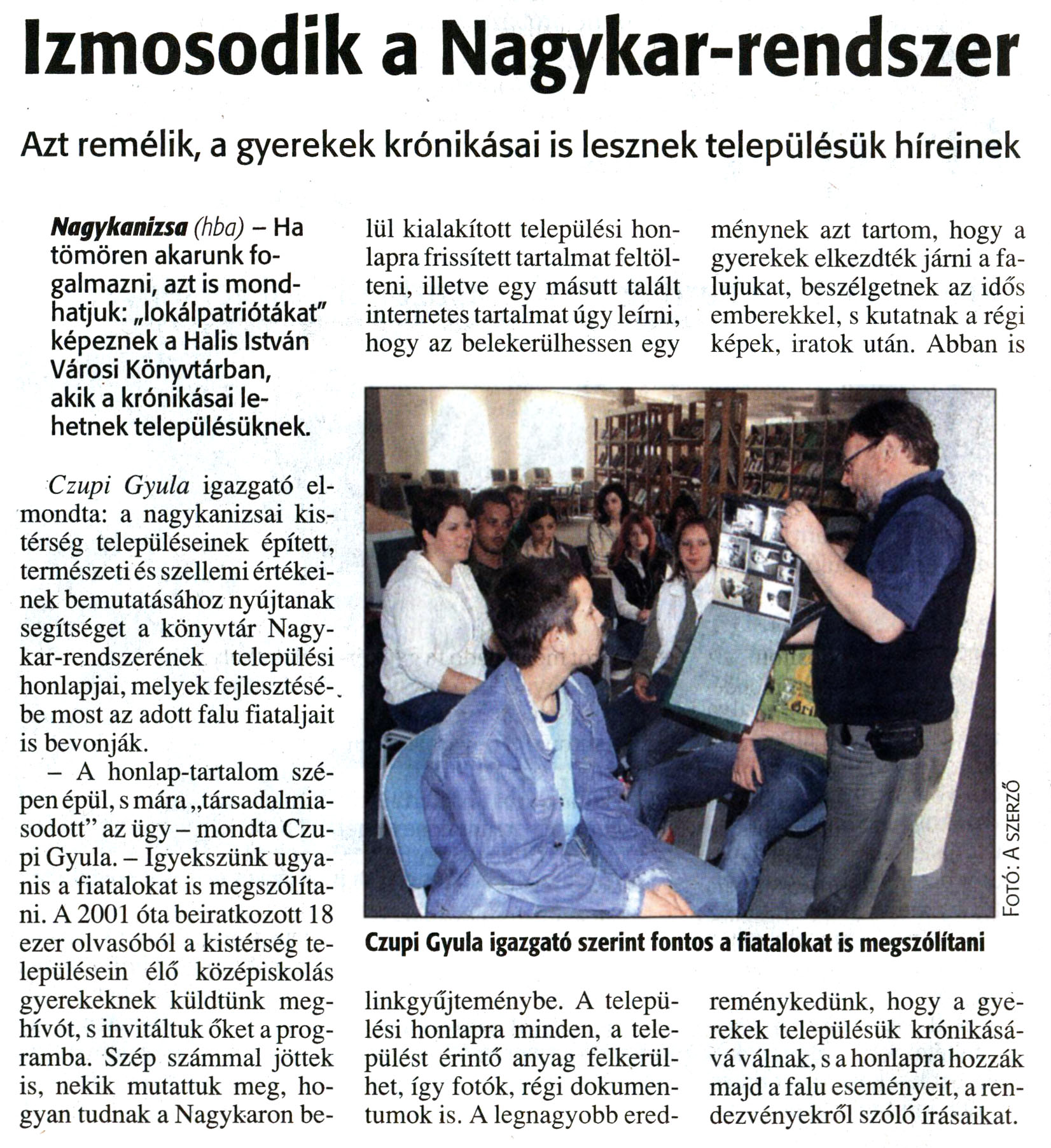 Nyilvános 14562 | 29201 | Zalai Hírlap 2008. június 9. 133. szám 12. oldal - Izmosodik a Nagykar-rendszer | A cikk szövege: Izmosodik a Nagykar-rendszer Azt remélik, a gyerekek krónikásai is lesznek településük híreinek Nagykanizsa (hba) - Ha tömören akarunk fogalmazni, azt is mondhatjuk: „lokálpatriótákat" képeznek a Halis István Városi Könyvtárban, akik a krónikásai lehetnek településüknek. Czupi Gyula igazgató elmondta: a nagykanizsai kistérség településeinek épített, természeti és szellemi értékeinek bemutatásához nyújtanak segítséget a könyvtár Nagykar-rendszerének települési honlapjai, melyek fejlesztésébe most az adott falu fiataljait is bevonják. - A honlap-tartalom szépen épül, s mára „társadalmiasodott" az ügy - mondta Czupi Gyula. - Igyekszünk ugyanis a fiatalokat is megszólítani. A 2001 óta beiratkozott 18 ezer olvasóból a kistérség településein élő középiskolás gyerekeknek küldtünk meghívót, s invitáltuk őket a programba. Szép számmal jöttek is, nekik mutattuk meg, hogyan tudnak a Nagykaron belül kialakított települési honlapra frissített tartalmat feltölteni, illetve egy másutt talált internetes tartalmat úgy leírni, hogy az belekerülhessen egy linkgyűjteménybe. A települési honlapra minden, a települést érintő anyag felkerülhet, így fotók, régi dokumentumok is. A legnagyobb eredménynek azt tartom, hogy a gyerekek elkezdték járni a falujukat, beszélgetnek az idős emberekkel, s kutatnak a régi képek, iratok után. Abban is reménykedünk, hogy a gyerekek településük krónikásává válnak, s a honlapra hozzák majd a falu eseményeit, a rendezvényekről szóló írásaikat. Képaláírás: Czupi Gyula igazgató szerint fontos a fiatalokat is megszólítani |