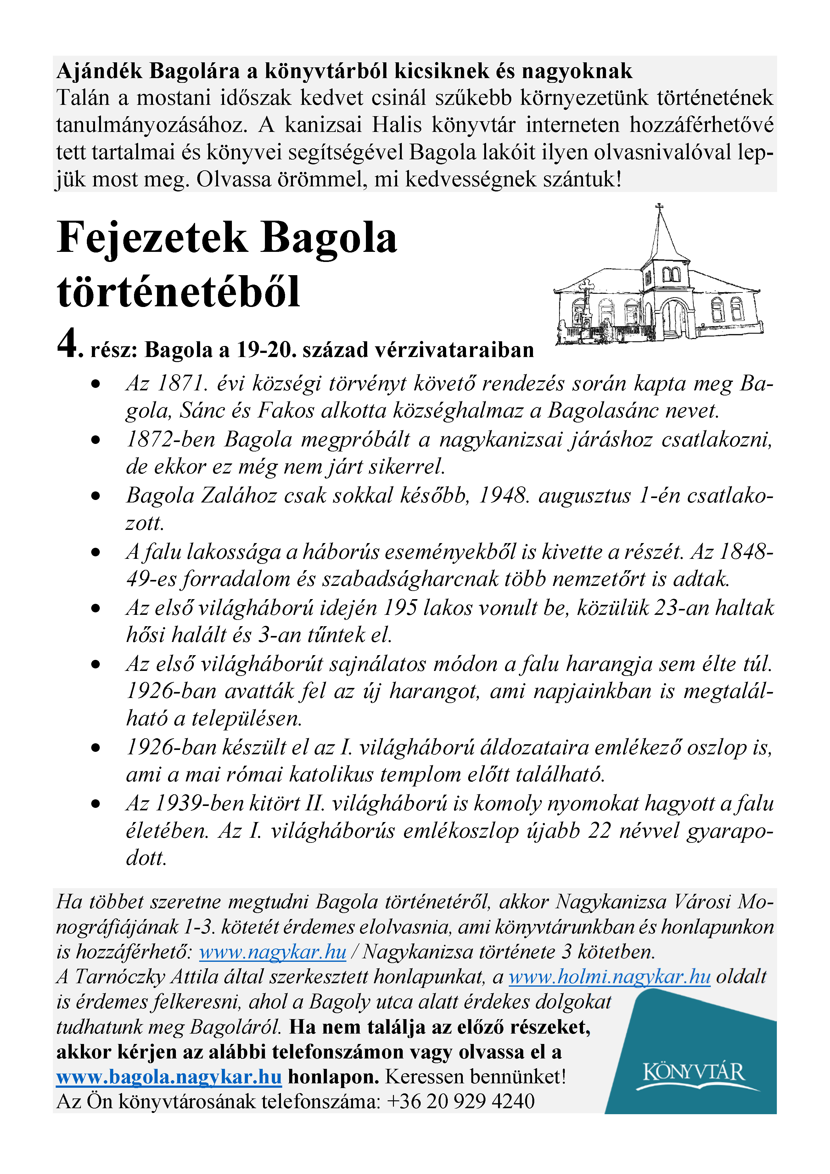 Nyilvános 1741 | 2655 | Megjelenés: 2021. május 7. | Ajándék Bagolára a könyvtárból kicsiknek és nagyoknak Talán a mostani időszak kedvet csinál szűkebb környezetünk történetének tanulmányozásához. A kanizsai Halis könyvtár interneten hozzáférhetővé tett tartalmai és könyvei segítségével Bagola lakóit ilyen olvasnivalóval lepjük most meg. Olvassa örömmel, mi kedvességnek szántuk! Fejezetek Bagola történetéből 4. rész: Bagola a 19-20. század vérzivataraiban • Az 1871. évi községi törvényt követő rendezés során kapta meg Bagola, Sánc és Fakos alkotta községhalmaz a Bagolasánc nevet. • 1872-ben Bagola megpróbált a nagykanizsai járáshoz csatlakozni, de ekkor ez még nem járt sikerrel. • Bagola Zalához csak sokkal később, 1948. augusztus 1-én csatlakozott. • A falu lakossága a háborús eseményekből is kivette a részét. Az 1848-49-es forradalom és szabadságharcnak több nemzetőrt is adtak. • Az első világháború idején 195 lakos vonult be, közülük 23-an haltak hősi halált és 3-an tűntek el. • Az első világháborút sajnálatos módon a falu harangja sem élte túl. 1926-ban avatták fel az új harangot, ami napjainkban is megtalálható a településen. • 1926-ban készült el az I. világháború áldozataira emlékező oszlop is, ami a mai római katolikus templom előtt található. • Az 1939-ben kitört II. világháború is komoly nyomokat hagyott a falu életében. Az I. világháborús emlékoszlop újabb 22 névvel gyarapodott. Ha többet szeretne megtudni Bagola történetéről, akkor Nagykanizsa Városi Monográfiájának 1-3. kötetét érdemes elolvasnia, ami könyvtárunkban és honlapunkon is hozzáférhető: www.nagykar.hu / Nagykanizsa története 3 kötetben. A Tarnóczky Attila által szerkesztett honlapunkat, a www.holmi.nagykar.hu oldalt is érdemes felkeresni, ahol a Bagoly utca alatt érdekes dolgokat tudhatunk meg Bagoláról. Ha nem találja az előző részeket, akkor kérjen az alábbi telefonszámon vagy olvassa el a www.bagola.nagykar.hu honlapon. Keressen bennünket! Az Ön könyvtárosának telefonszáma: +36 20 929 4240 |